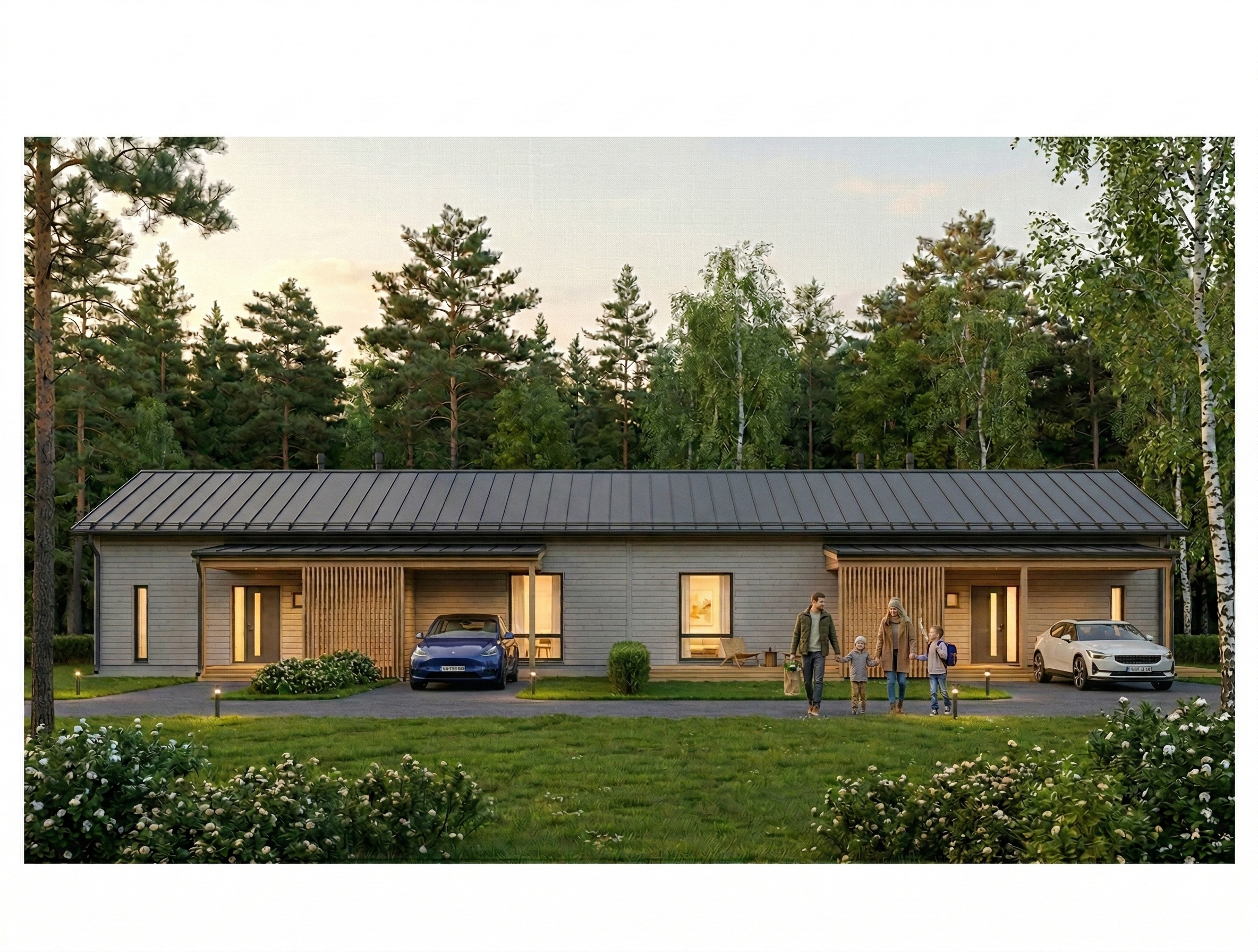 Tämä upeasti suunniteltu paritalo on suunniteltu ajatuksella modernista, ajattomasta ja käytännöllisestä arjesta. Arkkitehti Siiri Turpeinen on luonut tilaratkaisut, jotka korostavat valoa, tilan tuntua ja harmonista elinympäristöä — kodin, jossa jokainen huone tuntuu juuri oikealta.